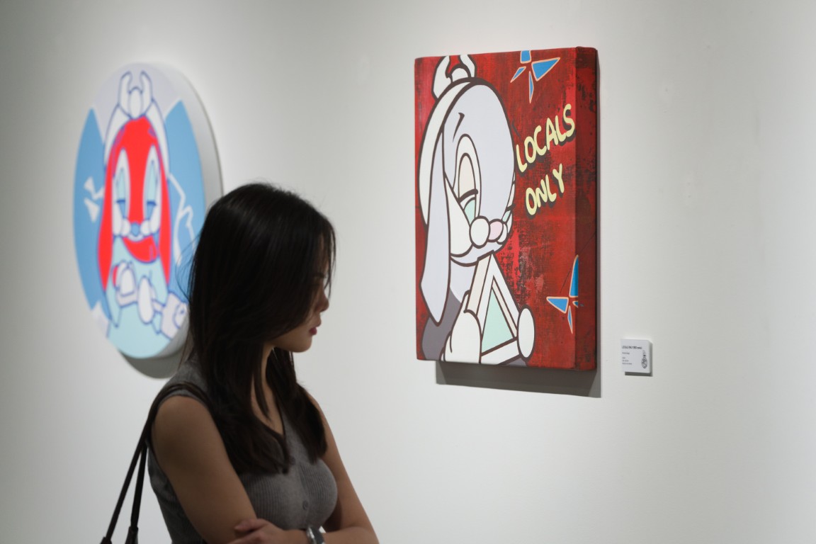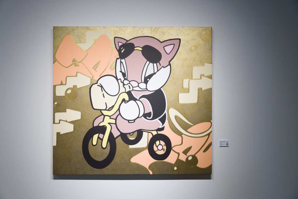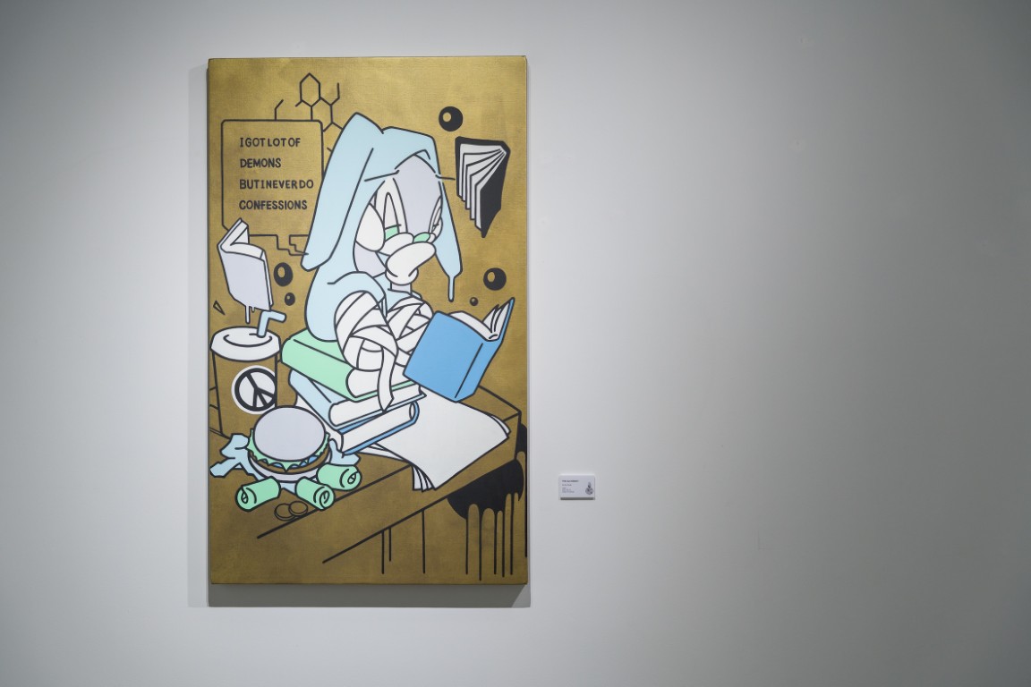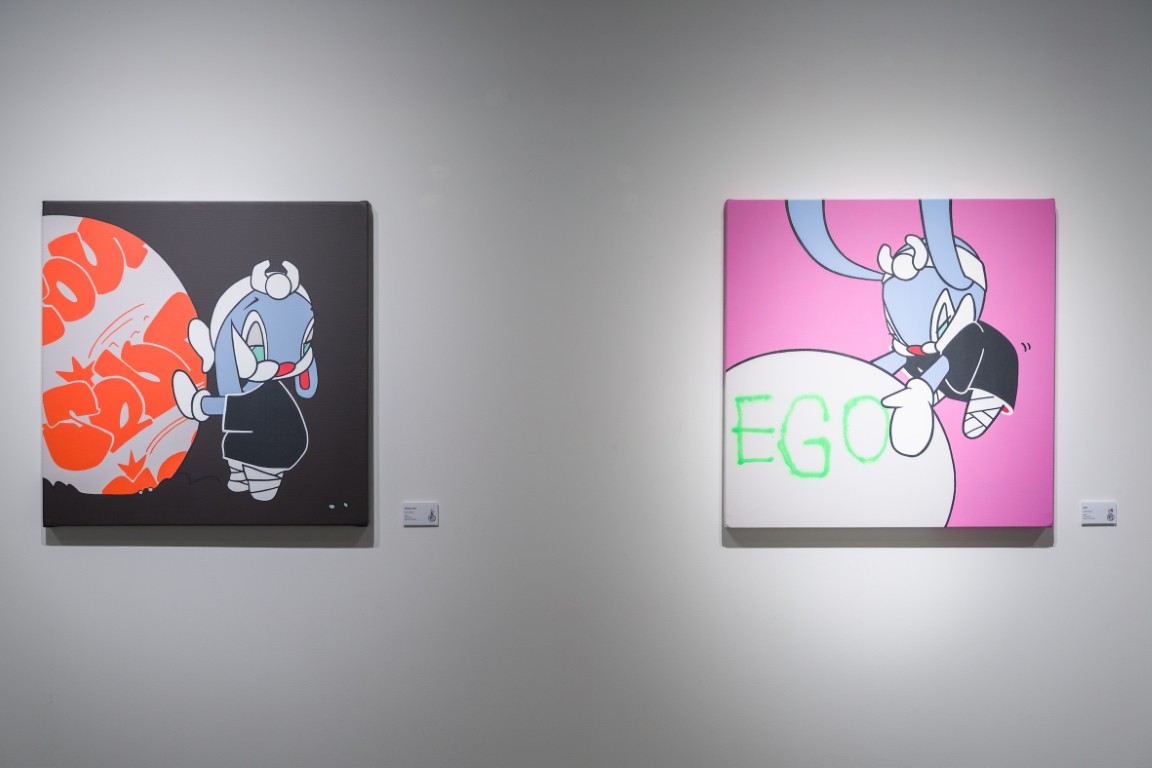A recurring motif in the artist’s paintings, ZERO symbolizes human resilience in the noise-heavy information age of modern society. Though constantly wounded, it is always reborn. The character reflects a duality, struggling with inner conflict while overcoming it with an inexplicable sense of optimism.
