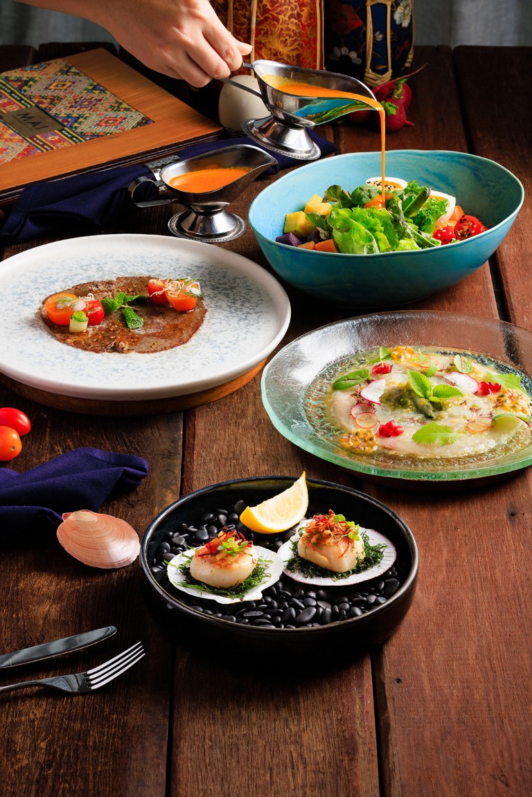The new menu’s six appetisers range from ‘Hoi Shell Samunprai’ featuring hot seared deep blue sea scallops, dried chili drops and turmeric chip, to ‘Khao Soi Salad’, a mixed salad bowl with fresh produce from the farms, accompanied by khao soi dressing, tai lue tofu, wheat, and cage-free eggs.