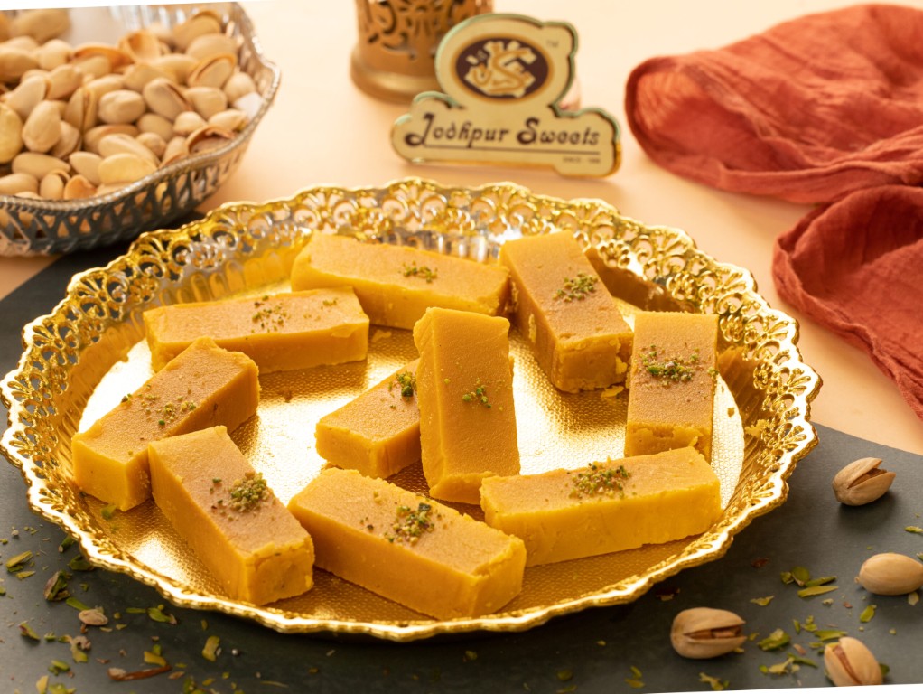 - โซนปาปดี (Soan Papdi): ขนมหวานยอดนิยมที่มีเนื้อสัมผัสเบาบางคล้ายรังไหมอ่อนนุ่ม สามารถละลายในปากได้ง่าย ทำจากแป้งถั่วลูกไก่ แป้งสาลี น้ำตาล และเนยใส ผสมกันแล้วดึงจนเกิดเป็นเส้นใยบางเบาคล้ายใยแมงมุม และตัดเป็นชิ้นสี่เหลี่ยมเล็ก ๆ สื่อถึงความเบาและอ่อนโยน เป็นขนมที่นิยมมอบให้กันในเทศกาลต่าง ๆ สามารถถวายเทพเจ้าได้ทั่วไป